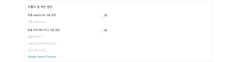 • 맞춤 로봇 헤더 태그 사용 설정 - 생략하셔도 무방합니다. 비활성화 유지.