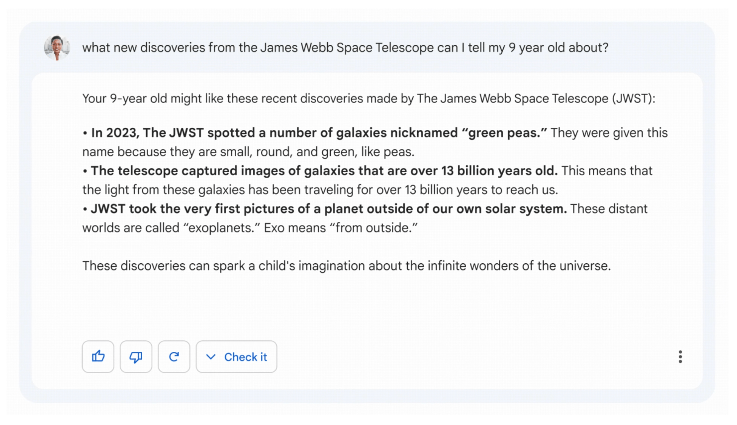 결과물의 형태는 이미 람다와 챗GPT에서 확인한 것과 크게 다르지 않을 것입니다. 사용자가 궁금한 내용을 사용자가 원하는 형식과 분량에 맞춰 바드가 수집한 정보를 스스로 정리해 출력해 주게 되죠.