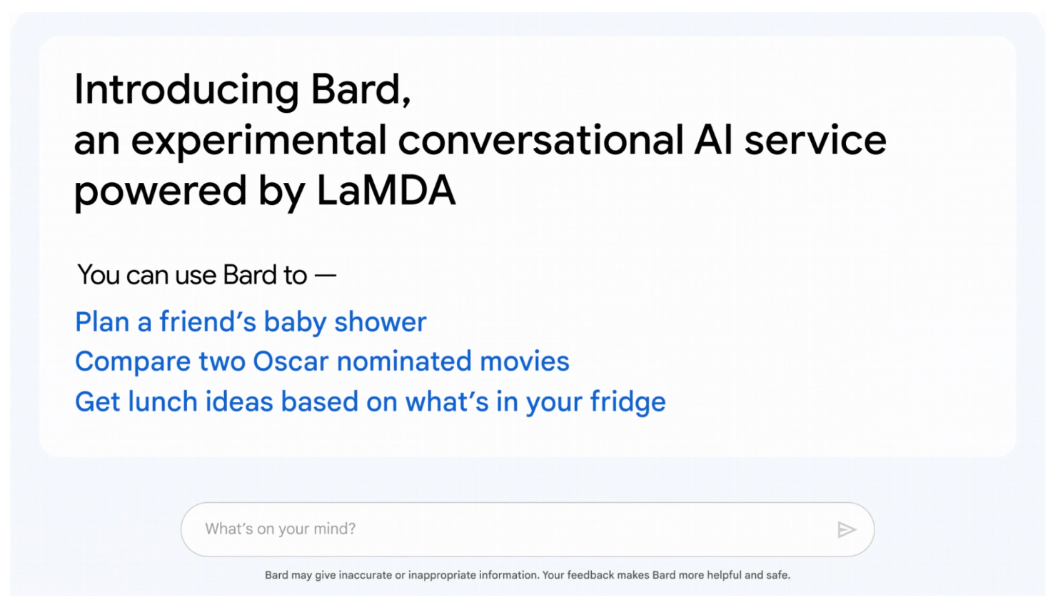 Introducing Bard, Google's experimental conversational AI service powered by LaMDA — plus, new AI features in Search coming soon.