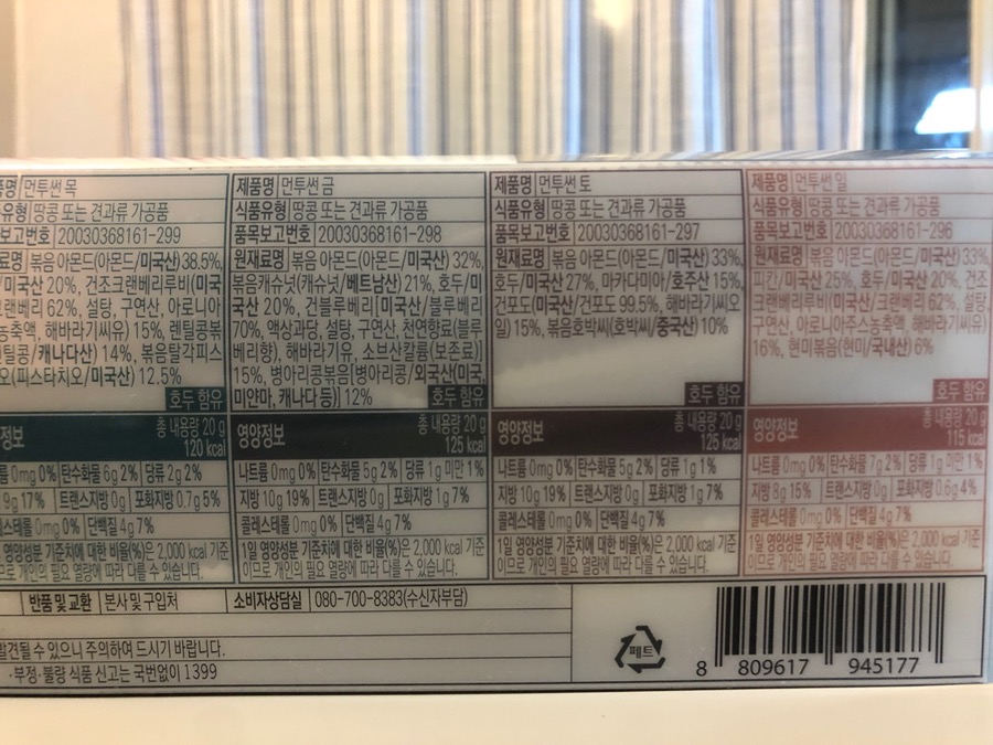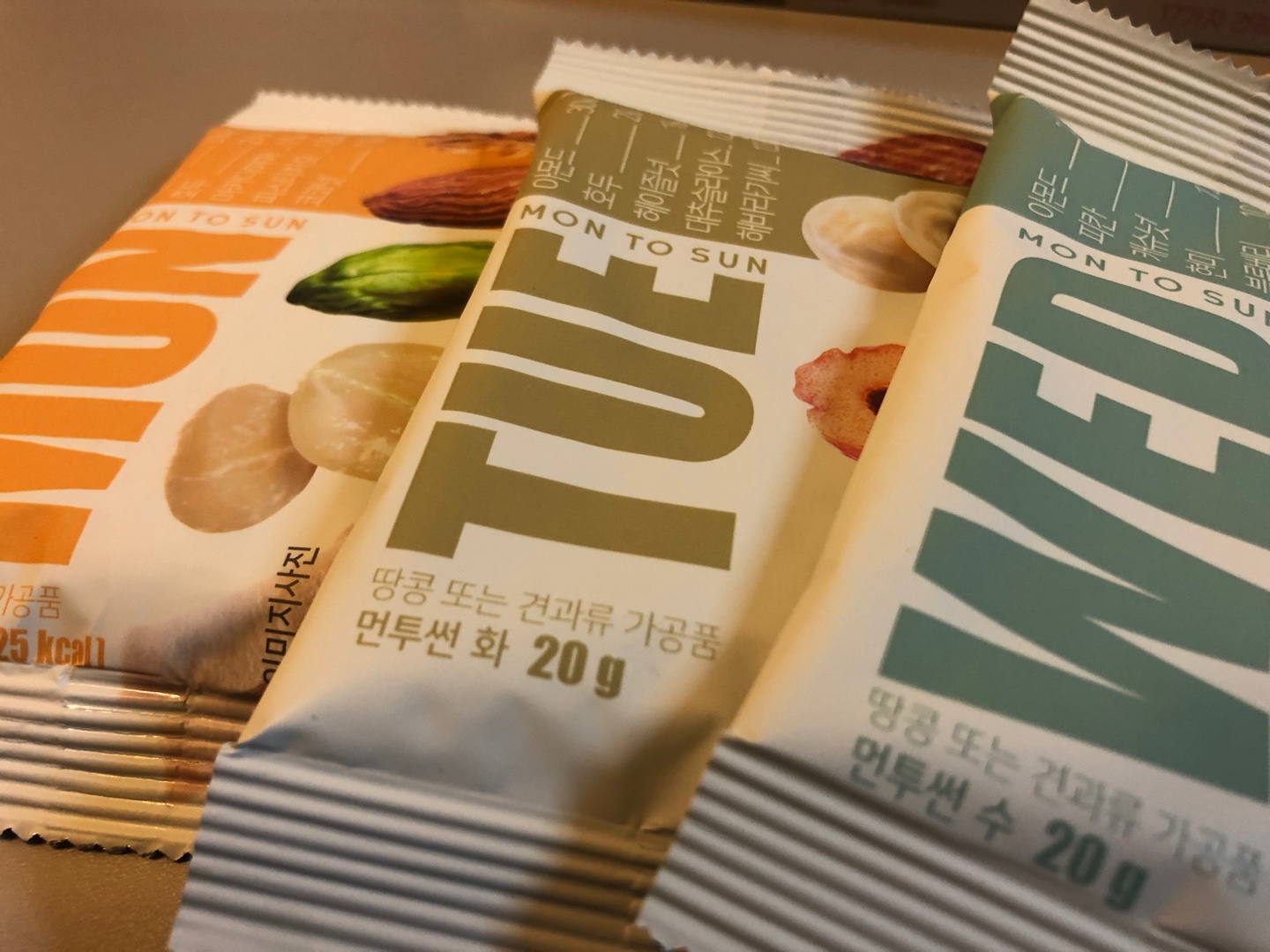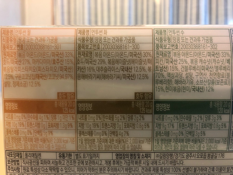 내용물인 견과류의 퀄리티가 최상이라고 할 수 없지만, 시중에 나와있는 정말 다양한 견과류 제품을 먹어본 1인으로서 이 정도면 꽤 준수한 수준인것 같아요! 아래 요일별 견과류와 원재료명 확인하실 수 있게 사진 함께 올려둘게요!