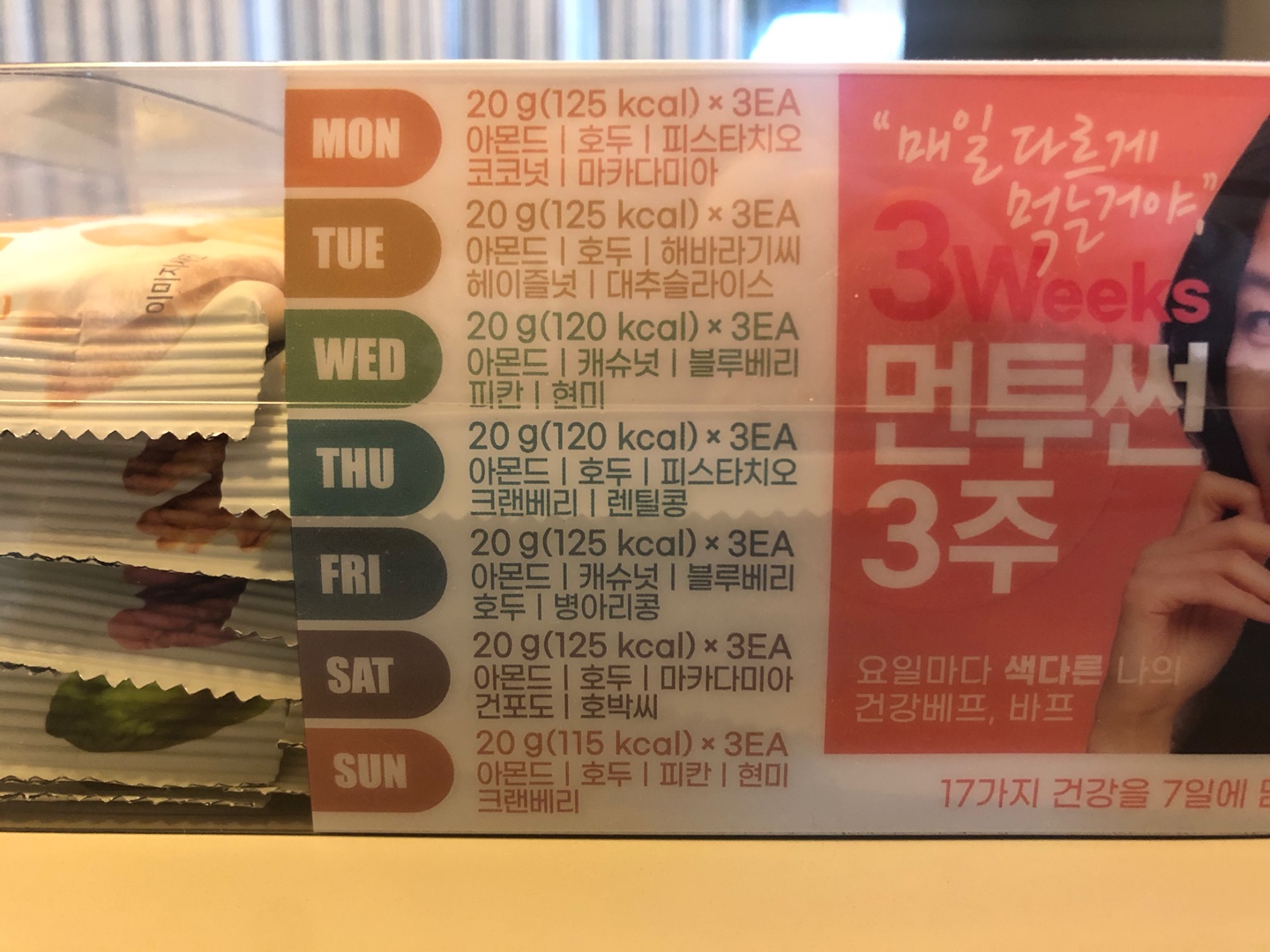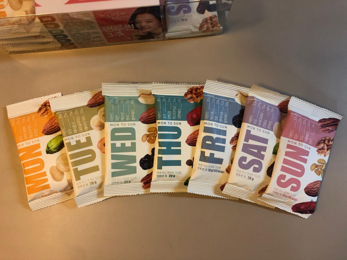 요일별로 조금씩 다르게 견과와 마른베리류를 섞어서 먹을 수 있다는게 같은 견과류를 매일 먹는 저 같은 사람에게는 완전 취향저격이예요! 그나저나 이번에 광고모델이 전지현에서 한소희로 바뀌었더라고요. 모델료랑 광고료가 상당할텐데, 매출도 그만큼 잘 나오고 있다는 거겠죠? 쓸데없이 남의 회사 걱정을ㅎㅎ