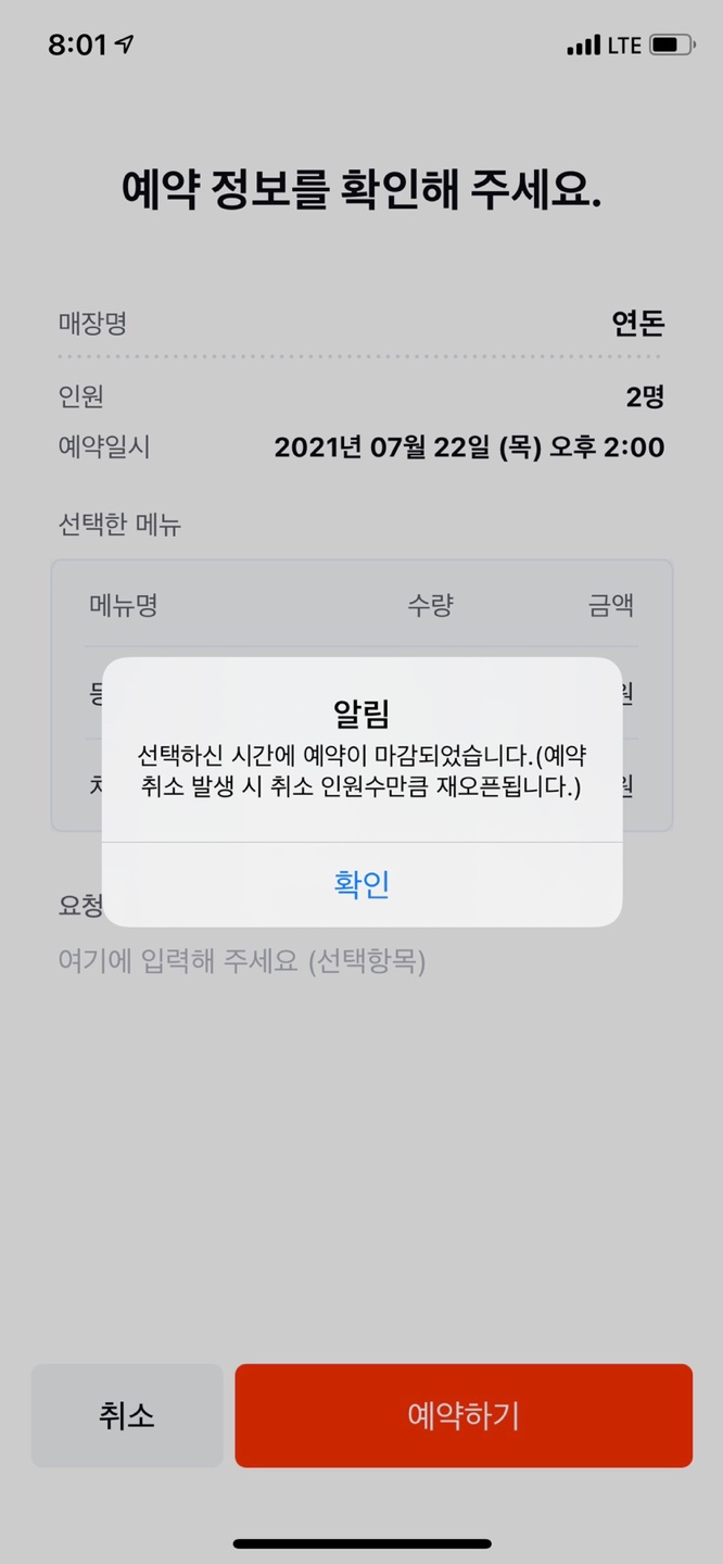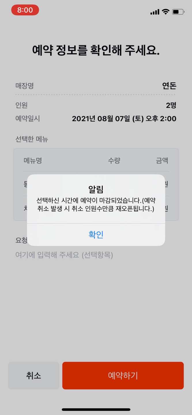 6. 8시가 되기 몇초전에 테이블링 앱으로 돌아온다.