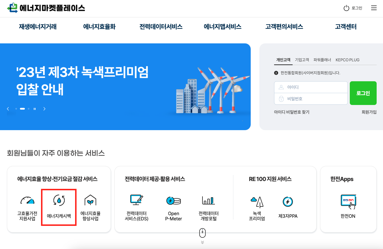 아래 링크를 선택하시면, 한전 에너지캐시백 페이지로 바로 이동합니다. 이 페이지에서는 전기절약 에너지캐시백 신청 및 캐시백 내역 조회, 절감목표 사용량 조회 등 이용이 가능합니다.