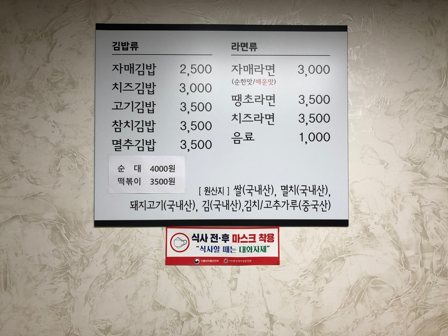 김밥, 라면, 떡볶이, 순대. 클래식이네요ㅎㅎ