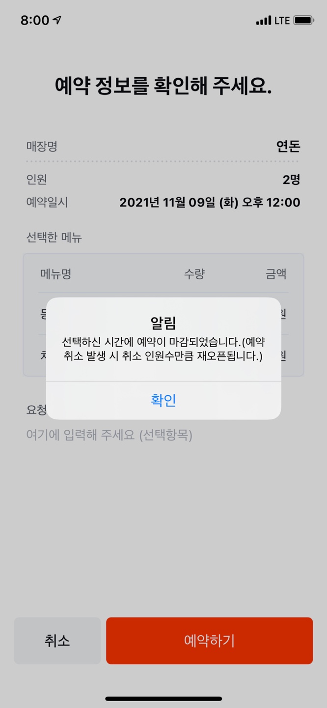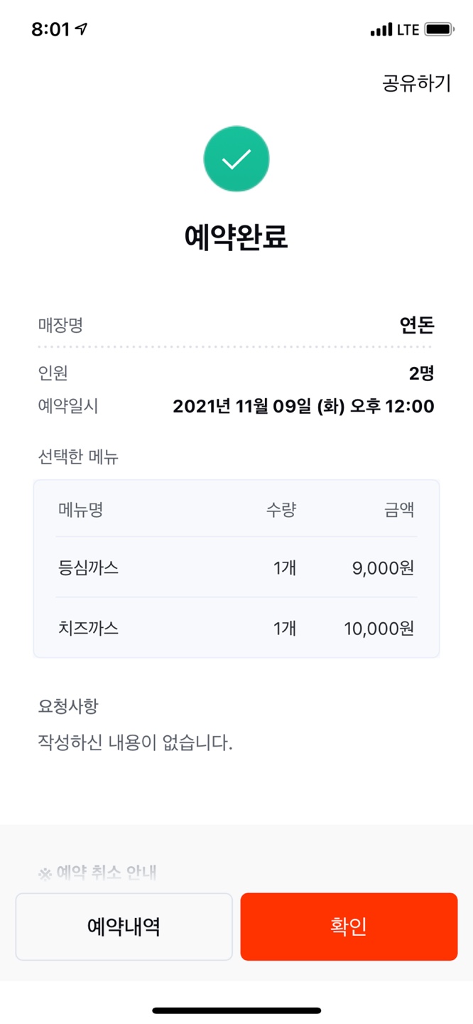 이번에도 역시 실패구먼! 하고 습관처럼 스크린샷으로 기록을 남겨둔 뒤, 새로고침을 반복을 시작했습니다. 보통 새로고침은 5분-10분까지도 하는데요. 한번도 되는적이 없었는데, 1분만에 갑자기 로딩이 길어지더니만! 예약완료라는 페이지가 떠버렸지뭐예요! 그렇습니다. 그렇게 약 3개월간의 연돈예약 대장정 끝에 저도 성공한거지요!