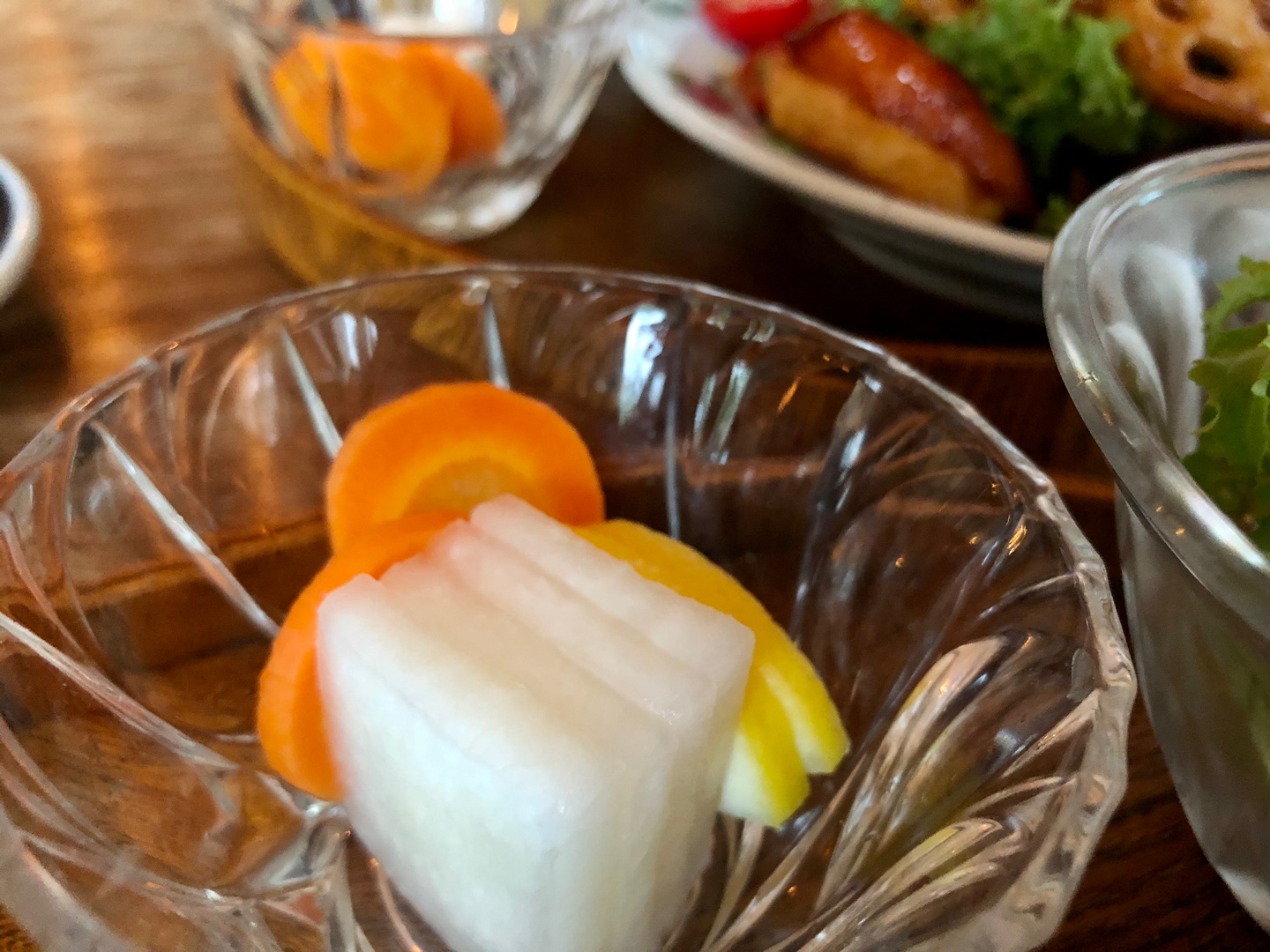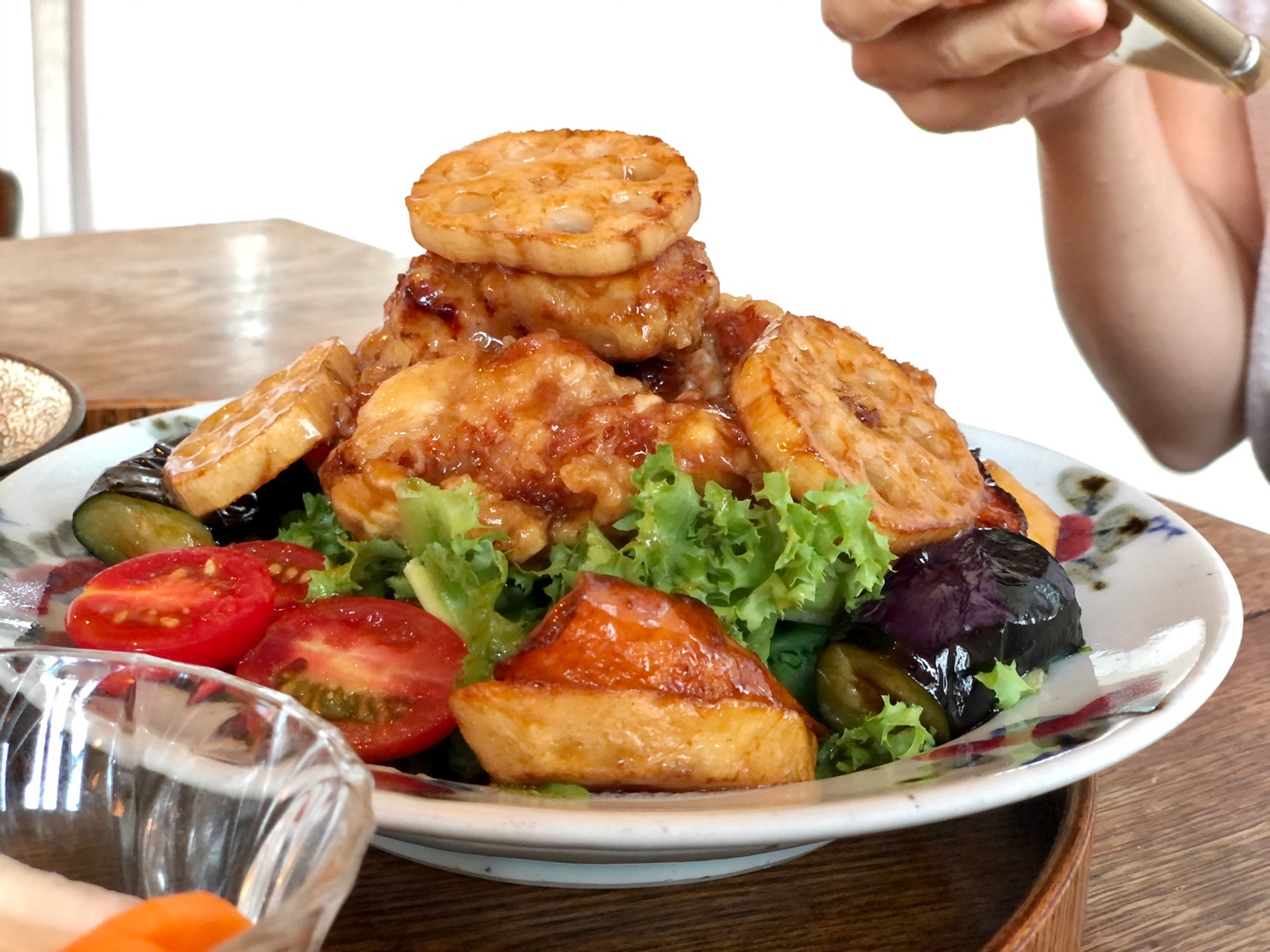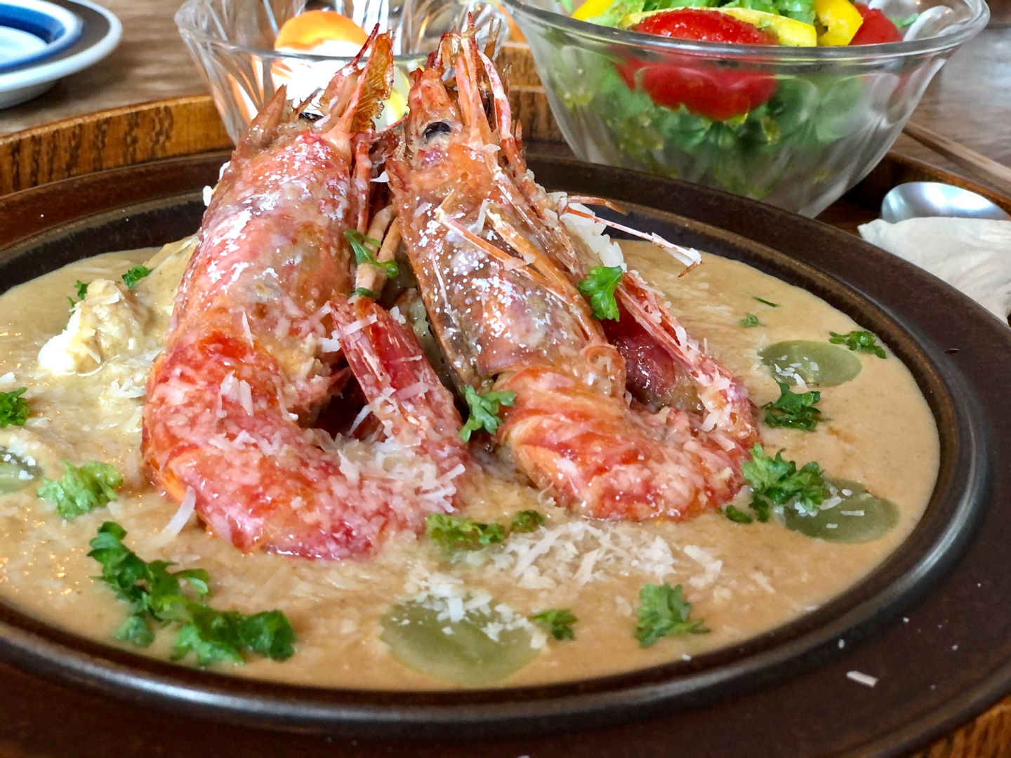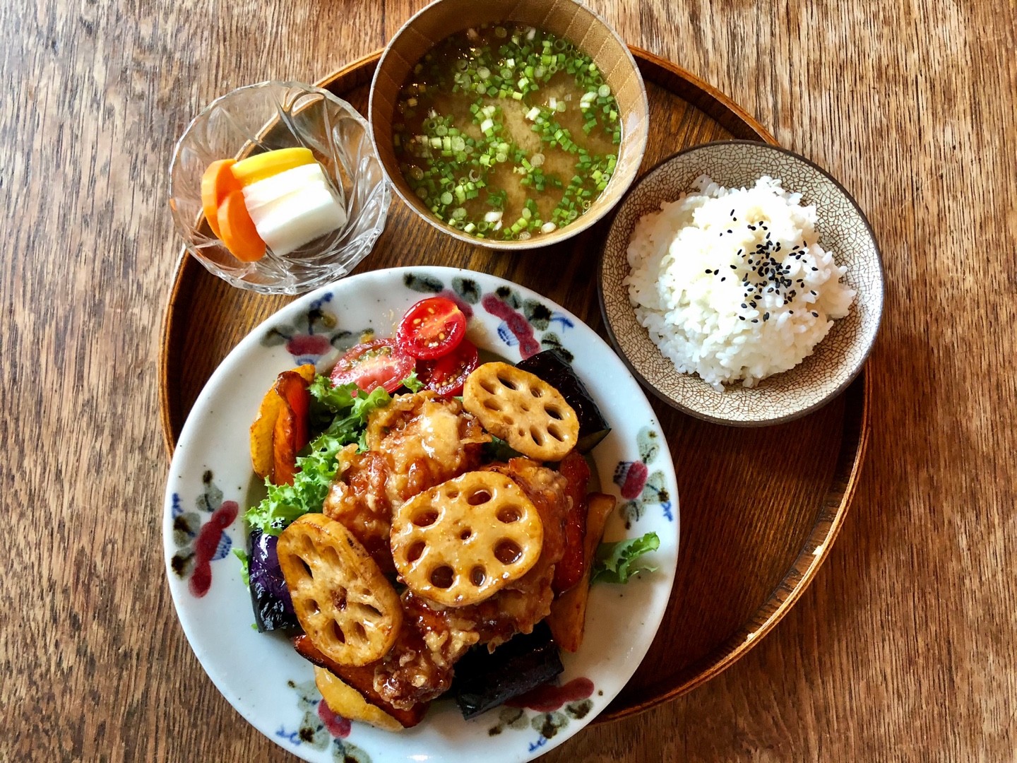 식사가 나왔습니다. 히비정식에는 싱싱한 각종 채소들, 그리고 튀겨진 닭고기가 어우러진 한 접시가 밥, 미소된장국, 절임채소와 함께 서빙됩니다. 히비카레는 일본식 카레에 커다란 새우 두마리가 얹혀져서 서빙되고요.