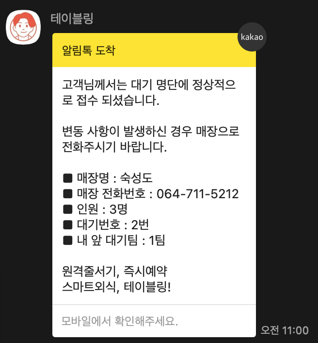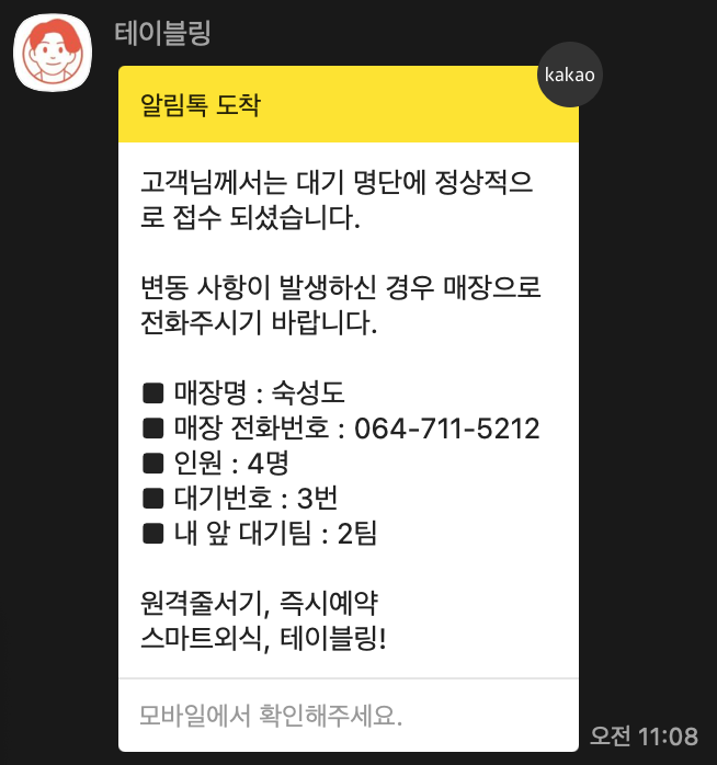 하지만, 매장입장에 대한 문자를 받으시고 5분 이내에는 매장으로 들어가셔야 합니다. 자칫 예약이 취소될 수도 있거든요. 그러니 너무 멀리 가지는 마시고, 혹시 가시더라도 시간을 잘 맞춰서 돌아오시는 일정으로 움직이시길 바랍니다.