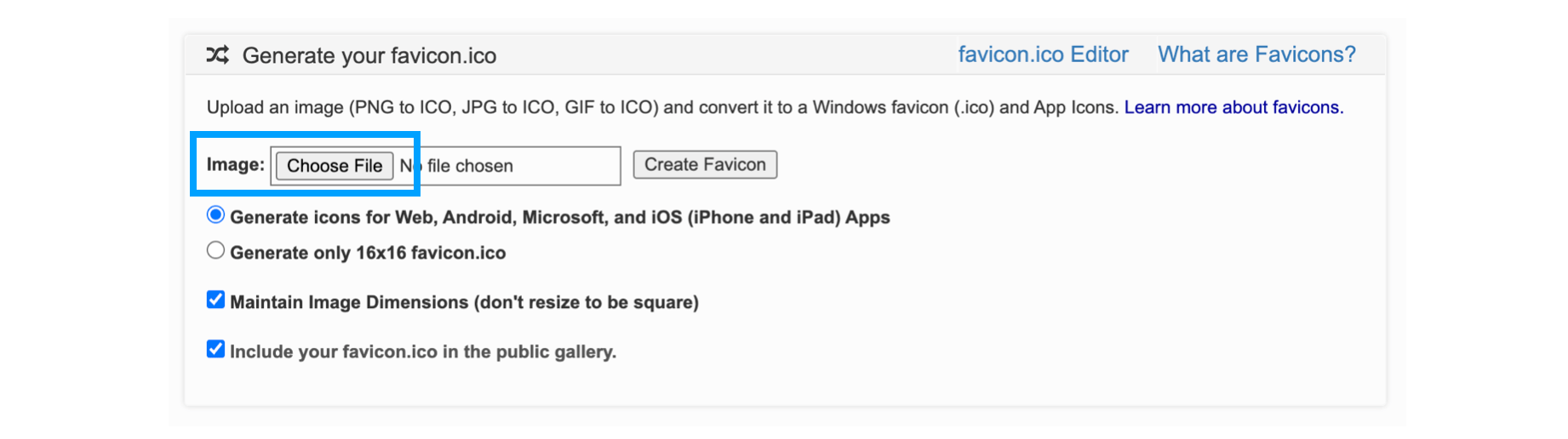 Upload an image (PNG to ICO, JPG to ICO, GIF to ICO) and convert it to a Windows favicon (.ico) and App Icons. Learn more about favicons.
